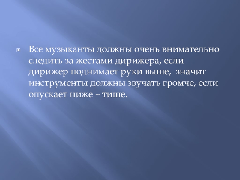 Слайд 32Все музыканты должны очень внимательно следить за жестами дирижера, если дирижер