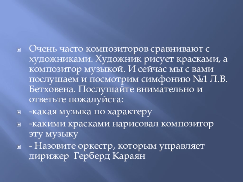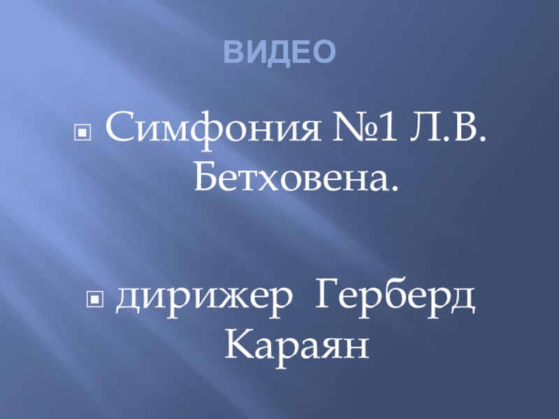 музыкой. И сейчас мы с вами послушаем и посмотрим симфонию №1 Л.В.Бетховена. Послушайте внимательно и ответьте пожалуйста: