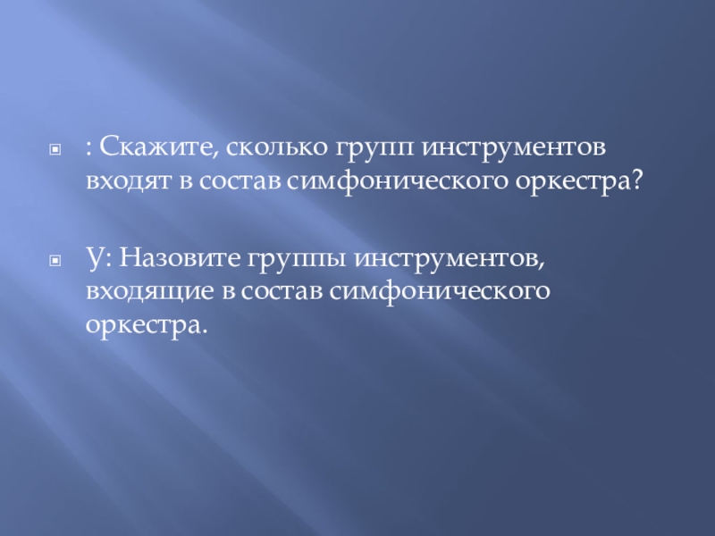 Слайд 17: Скажите, сколько групп инструментов входят в состав симфонического оркестра?