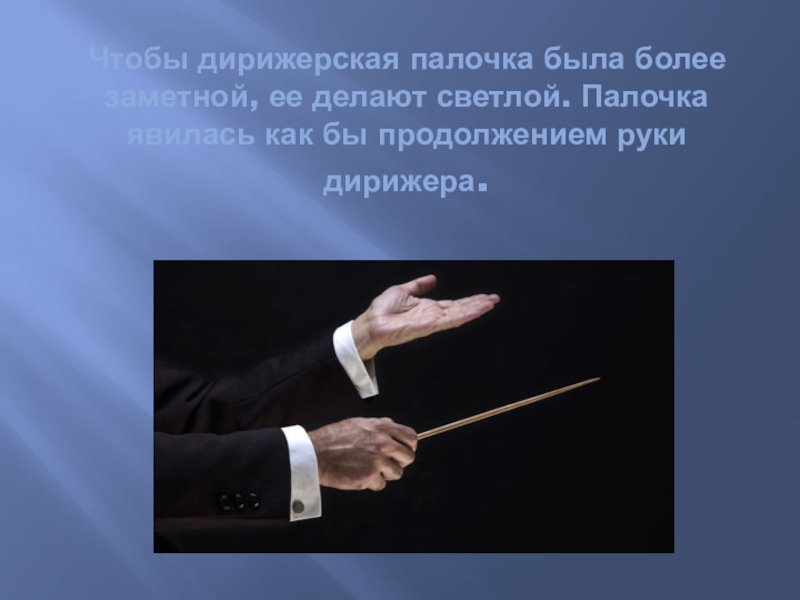 Слайд 28Чтобы дирижерская палочка была более заметной, ее делают светлой. Палочка явилась