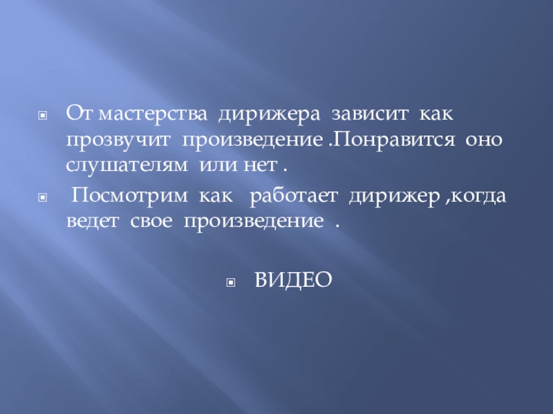 Слайд 40От мастерства дирижера зависит как прозвучит произведение .Понравится оно слушателям или