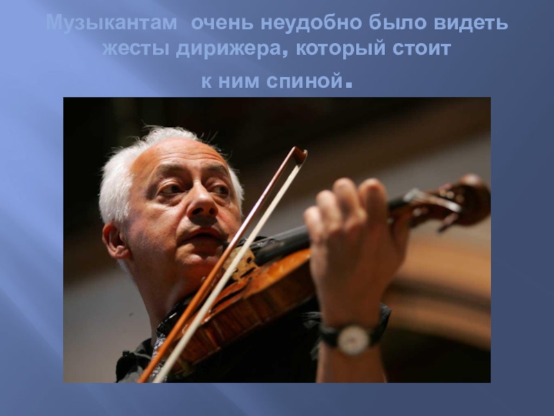 Слайд 26Музыкантам очень неудобно было видеть жесты дирижера, который стоит