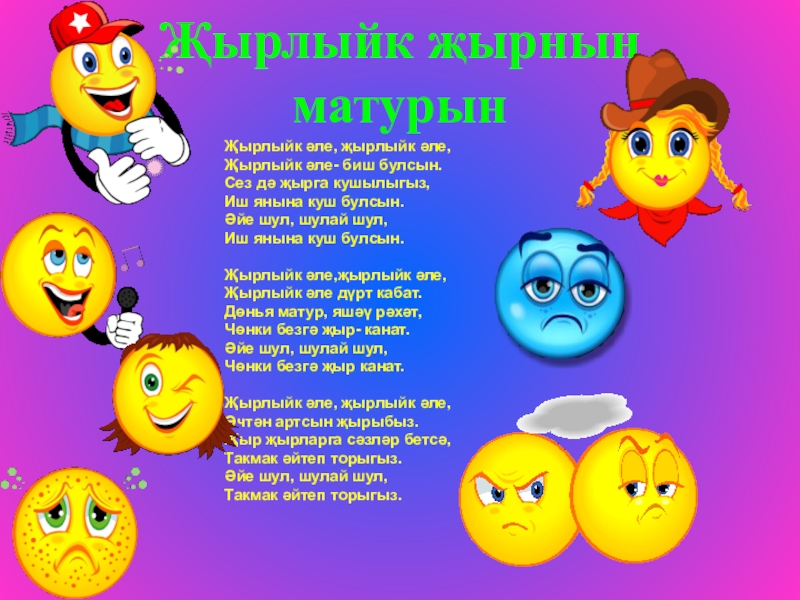 Җырлыйк җырның матурынҖырлыйк әле, җырлыйк әле,Җырлыйк әле- биш булсын.Сез дә җырга кушылыгыз,Иш янына куш булсын.Әйе шул, шулай
