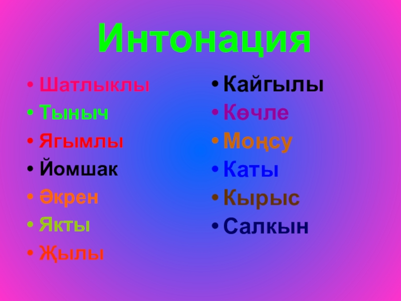 ИнтонацияШатлыклыТынычЯгымлыЙомшакӘкренЯктыҖылыКайгылыКөчлеМоңсуКатыКырысСалкын