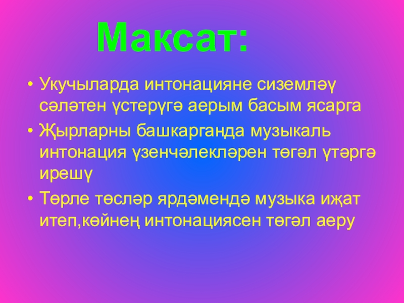 Максат:Укучыларда интонацияне сиземләү сәләтен үстерүгә аерым басым ясаргаҖырларны башкарганда музыкаль интонация үзенчәлекләрен төгәл үтәргә ирешү Төрле төсләр ярдәмендә музыка иҗат итеп,көйнең интонациясен төгәл аеру