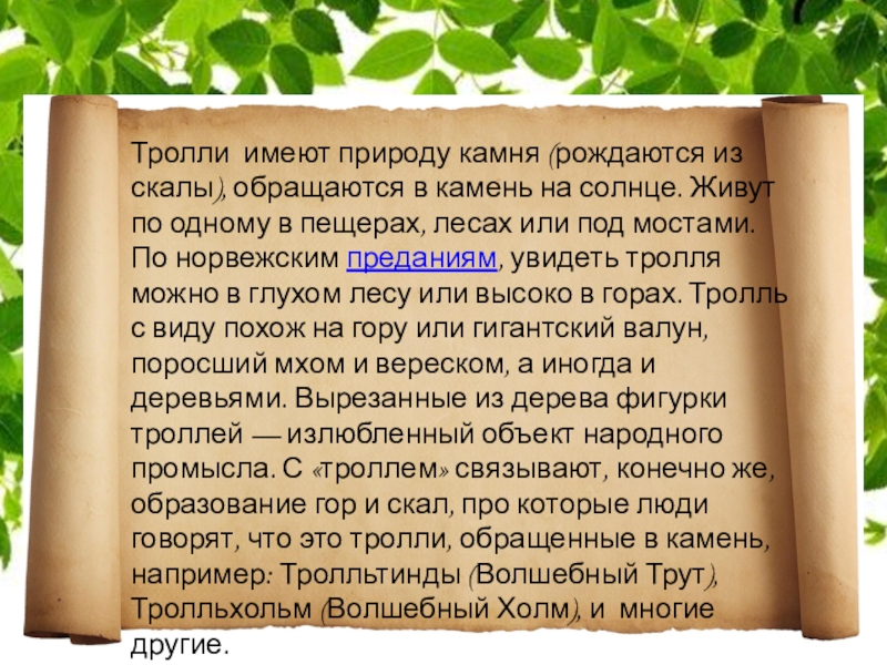 Слайд 49Тролли имеют природу камня (рождаются из скалы), обращаются в камень на