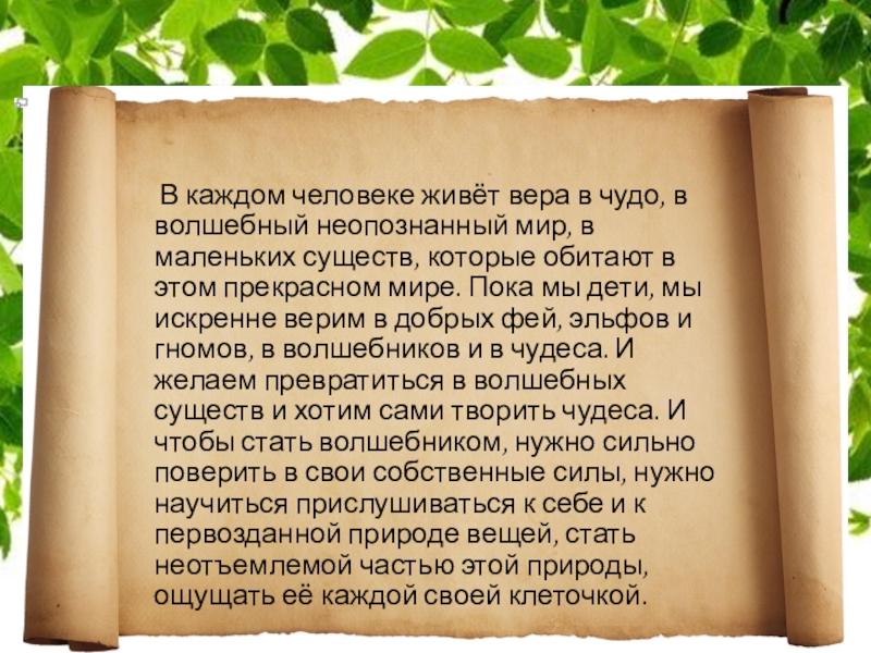мир, в маленьких существ, которые обитают в этом прекрасном мире. Пока мы дети, мы искренне верим в добрых фей, эльфов и гномов, в волшебников и в чудеса. И желаем превратиться в волшебных существ и хотим сами творить чудеса. И чтобы стать волшебником, нужно сильно поверить в свои собственные силы, нужно научиться прислушиваться к себе и к первозданной природе вещей, стать неотъемлемой частью этой природы, ощущать её каждой своей клеточкой.