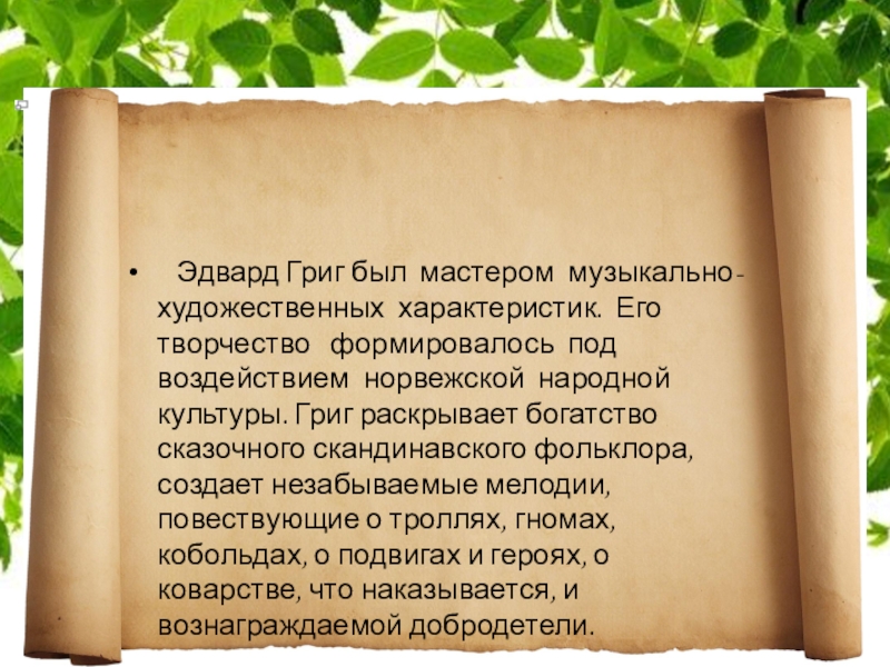 Его творчество формировалось под воздействием норвежской народной культуры. Григ раскрывает богатство сказочного скандинавского фольклора, создает незабываемые мелодии, повествующие о троллях, гномах, кобольдах, о подвигах и героях, о коварстве, что наказывается, и вознаграждаемой добродетели.