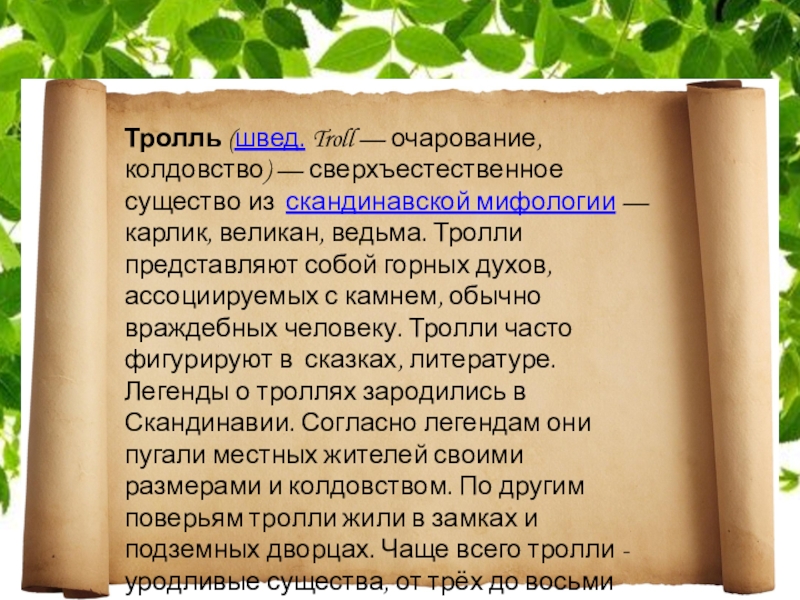 Слайд 48Тролль (швед. Troll — очарование, колдовство) — сверхъестественное существо из скандинавской мифологии — карлик,