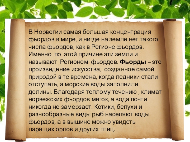земле нет такого числа фьордов, как в Регионе фьордов. Именно по этой причине эти земли и называют Регионом фьордов. Фьорды – это произведение искусства, созданное самой природой в те времена, когда ледники стали отступать, а морские воды заполнили долины. Благодаря теплому течению , климат норвежских фьордов мягок, а вода почти никогда не замерзает. Котики, белухи и разнообразные виды рыб населяют воды фьордов, а в вышине можно увидеть парящих орлов и других птиц.
