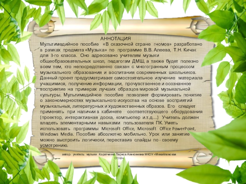 Мультимедийное пособие «В сказочной стране гномов» разработано в рамках предмета «Музыка» по программе В.В. Алеева, Т.Н. Кичак для 3-го класса. Оно адресовано учителям музыки общеобразовательных школ, педагогам ДМШ, а также будет полезно всем тем, кто непосредственно связан с многогранным процессом музыкального образования и воспитания современных школьников. Данный проект предусматривает самостоятельное изучение материала учащимися, получение информации, прочувственное и осознанное восприятие на примерах лучших образцов мировой музыкальной культуры. Мультимедийное пособие позволяет формировать понятие о закономерностях музыкального искусства на основе восприятий музыкальных, литературных и художественных образов. Его следует применять при наличии в кабинете соответствующего оборудования (проектор, интерактивная доска, компьютер и.т.д…) Учитель должен владеть элементарными навыками пользователя ПК. Уметь использовать программы Microsoft Office, Microsoft Office PowerPoint, Windows Media. Пособие абсолютно мобильно. Урок или занятие можно выстроить логически, переставив слайды по - своему усмотрению.
