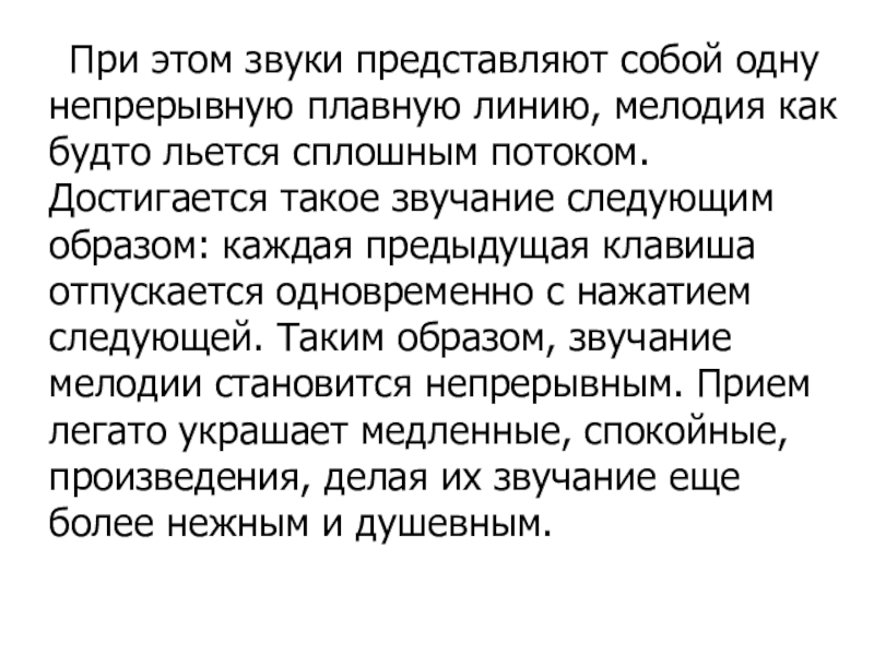 будто льется сплошным потоком. Достигается такое звучание следующим образом: каждая предыдущая клавиша отпускается одновременно с нажатием следующей. Таким образом, звучание мелодии становится непрерывным. Прием легато украшает медленные, спокойные, произведения, делая их звучание еще более нежным и душевным.