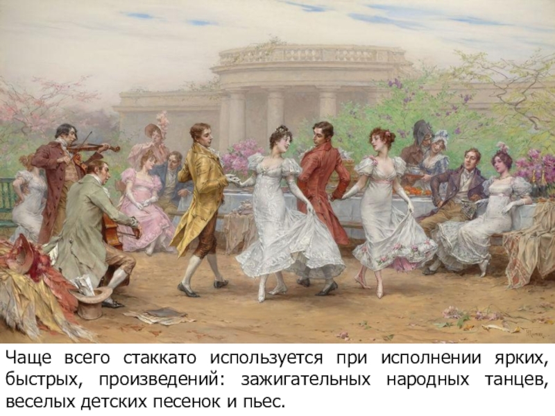 Слайд 23Чаще всего стаккато используется при исполнении ярких, быстрых, произведений: зажигательных народных