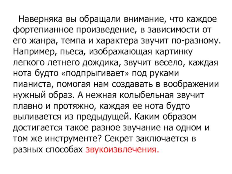 его жанра, темпа и характера звучит по-разному. Например, пьеса, изображающая картинку легкого летнего дождика, звучит весело, каждая нота будто «подпрыгивает» под руками пианиста, помогая нам создавать в воображении нужный образ. А нежная колыбельная звучит плавно и протяжно, каждая ее нота будто выливается из предыдущей. Каким образом достигается такое разное звучание на одном и том же инструменте? Секрет заключается в разных способах звукоизвлечения.