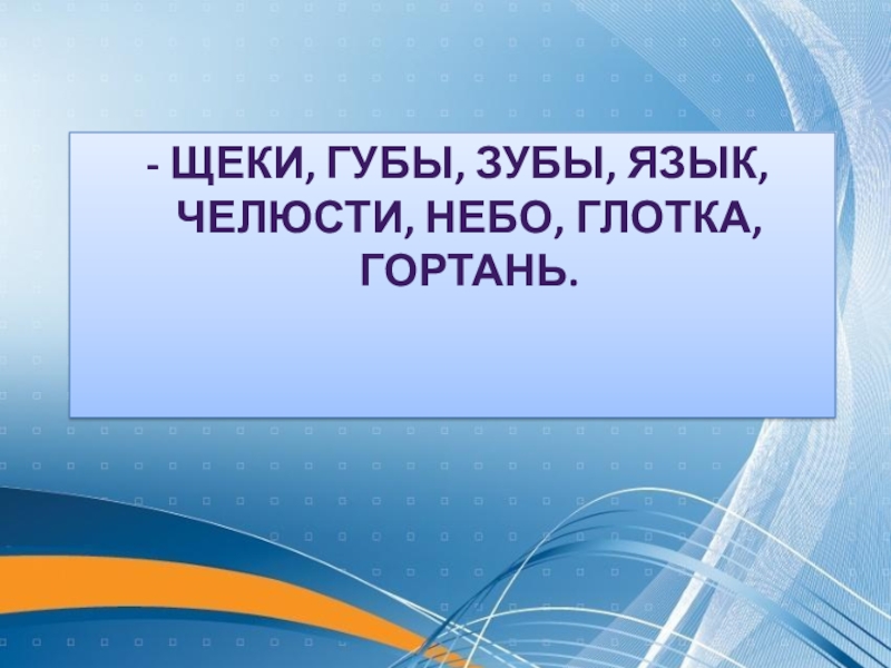 Слайд 6 - щеки, губы, зубы, язык, челюсти, небо, глотка, гортань.