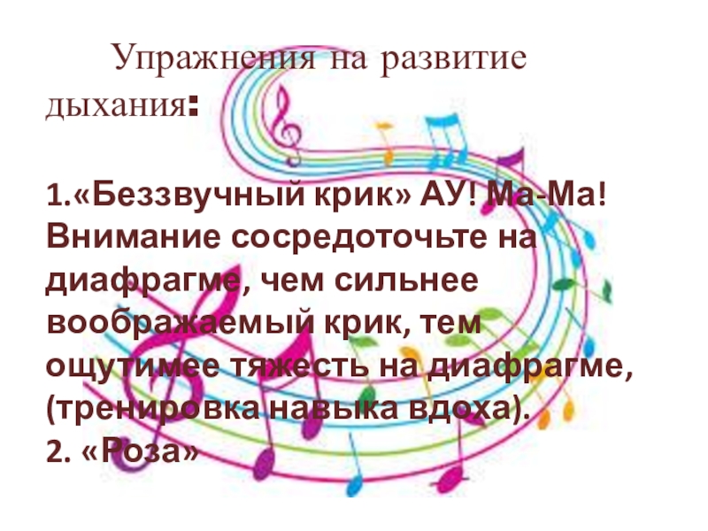 сосредоточьте на диафрагме, чем сильнее воображаемый крик, тем ощутимее тяжесть на диафрагме, (тренировка навыка вдоха).