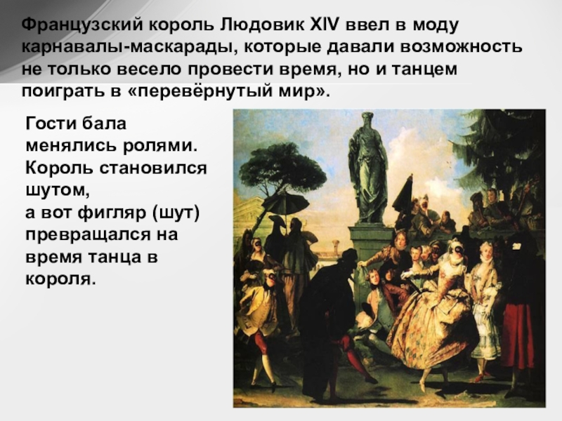 Слайд 22Французский король Людовик XIV ввел в моду карнавалы-маскарады, которые давали возможность