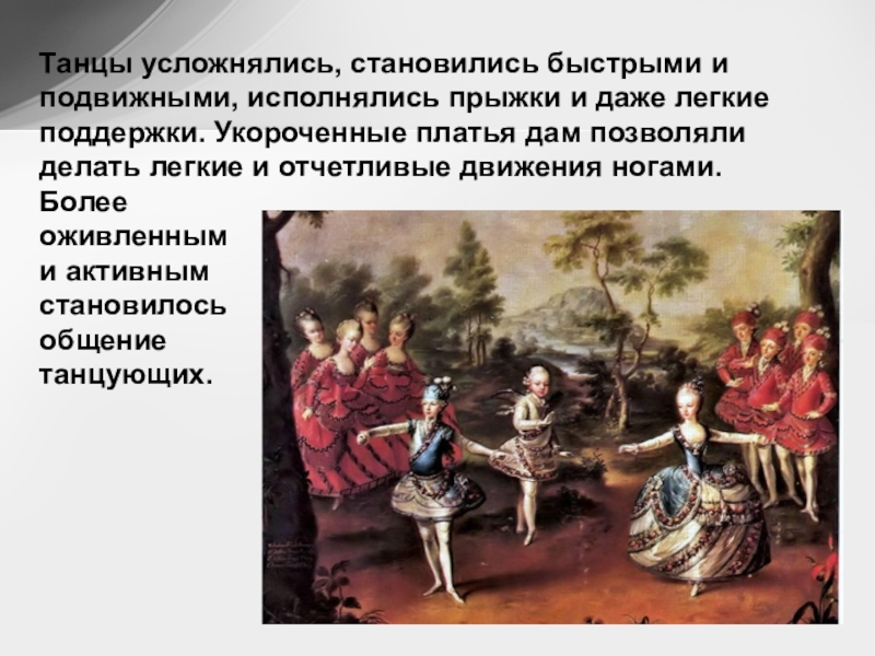 Слайд 28Танцы усложнялись, становились быстрыми и подвижными, исполнялись прыжки и даже легкие