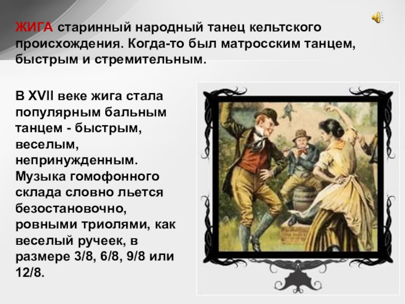 Слайд 32ЖИГА старинный народный танец кельтского происхождения. Когда-то был матросским танцем, быстрым