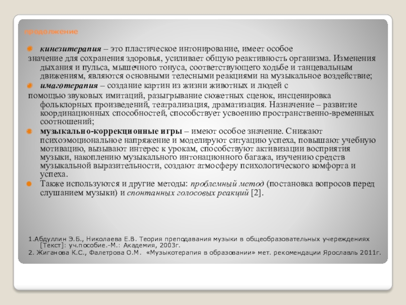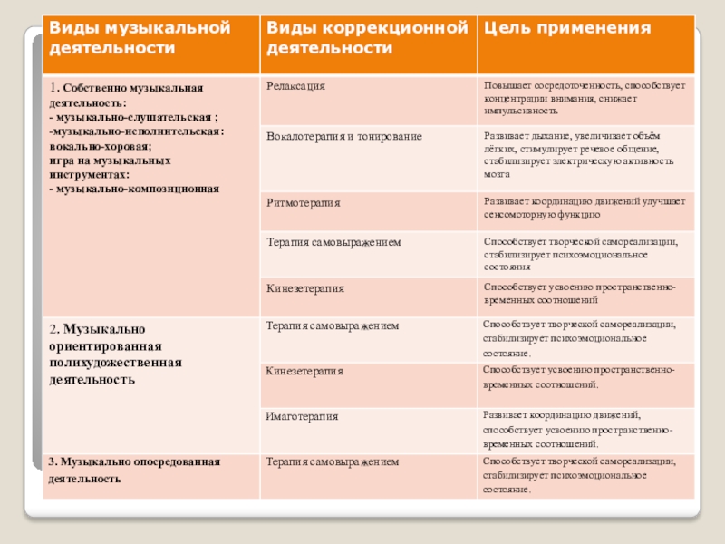ритмотерапия и терапия творческим самовыражением – используется на уроке в ходе игры на музыкальных инструментах, в мелодических, пластических и ритмических импровизациях. Они могут решать и образовательные задачи. Работа в группе даёт детям чувство уверенности, создаётся атмосфера эмоционального комфорта, развивает произвольное внимание. Назначение ритмотерапии – синхронизирует работу внутренних органов, терапии творческим самовыражением – сохранение психо-эмоционального здоровья ребёнка;