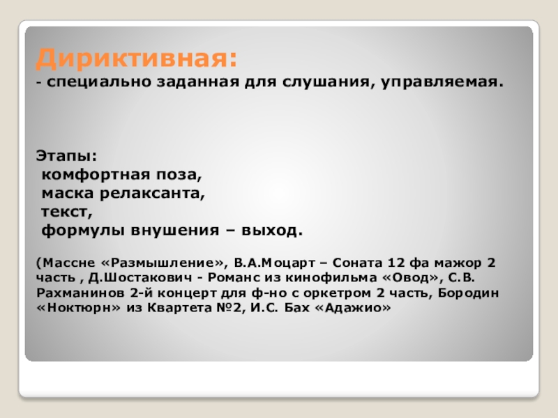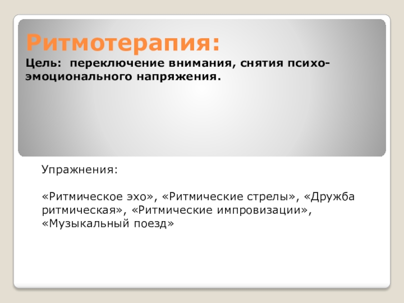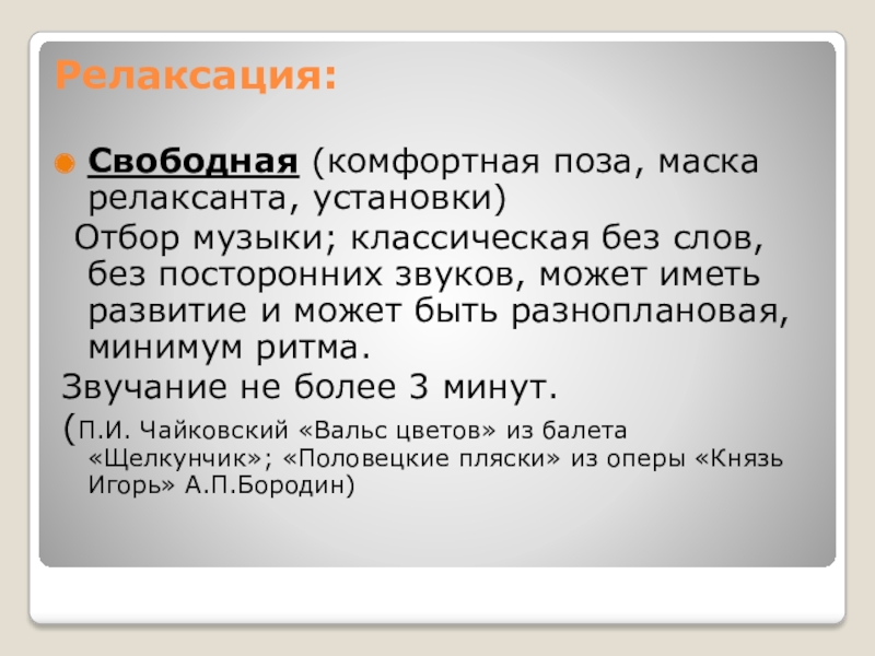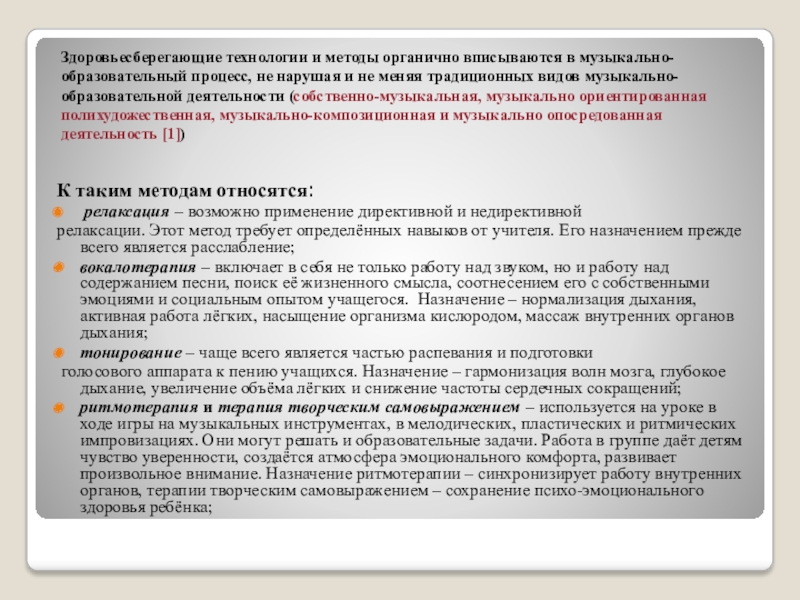 релаксации. Этот метод требует определённых навыков от учителя. Его назначением прежде всего является расслабление;