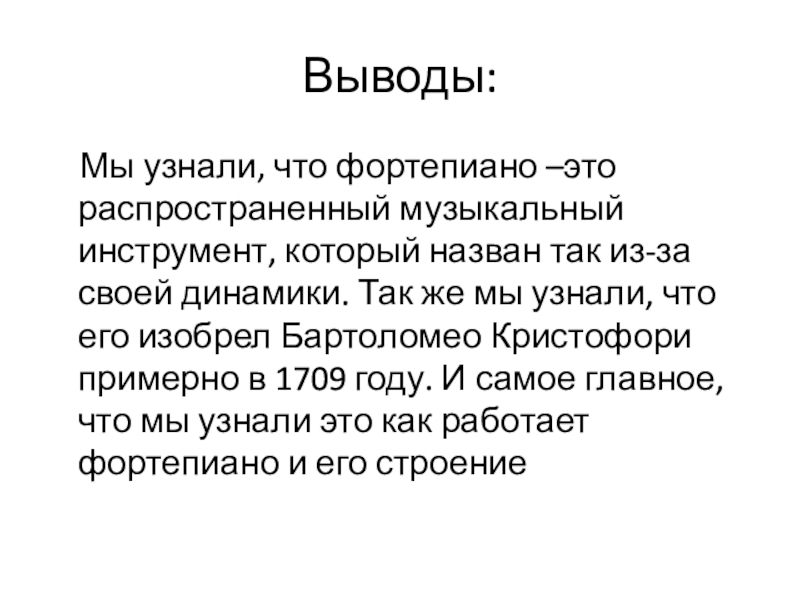 Мы узнали, что фортепиано –это распространенный музыкальный инструмент, который