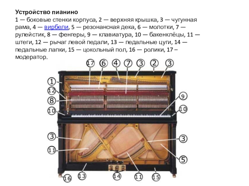 — чугунная рама, 4 — вирбели, 5 — резонансная дека, 6 — молотки, 7 — рулейстик, 8 — фенгеры, 9 — клавиатура, 10 — бакенклёцы, 11 — штеги, 12 — рычаг левой педали, 13 — педальные цуги, 14 — педальные лапки, 15 — цокольный пол, 16 — ролики, 17 – модератор.