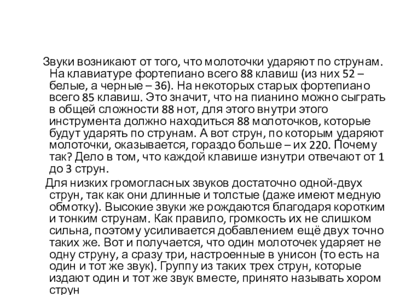 Слайд 8 Звуки возникают от того, что молоточки ударяют по струнам.