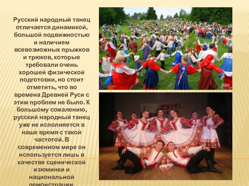 и трюков, которые требовали очень хорошей физической подготовки, но стоит отметить, что во времена Древней Руси с этим проблем не было. К большому сожалению, русский народный танец уже не исполняется в наше время с такой частотой. В современном мире он используется лишь в качестве сценической изюминки и национальной демонстрации.