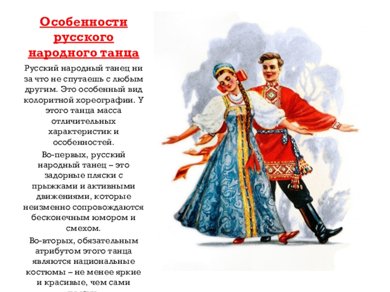 Слайд 12Русский народный танец отличается динамикой, большой подвижностью и наличием всевозможных прыжков