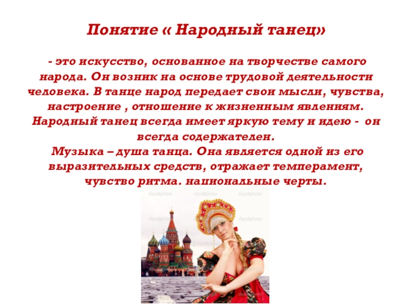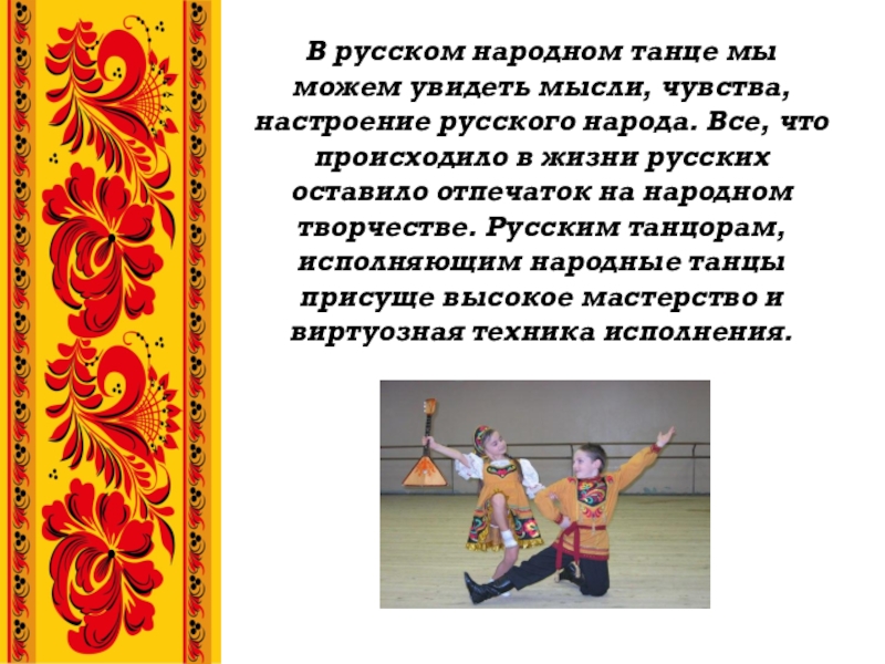 Слайд 4Русский народный танец – это танец с самой богатой и насыщенной