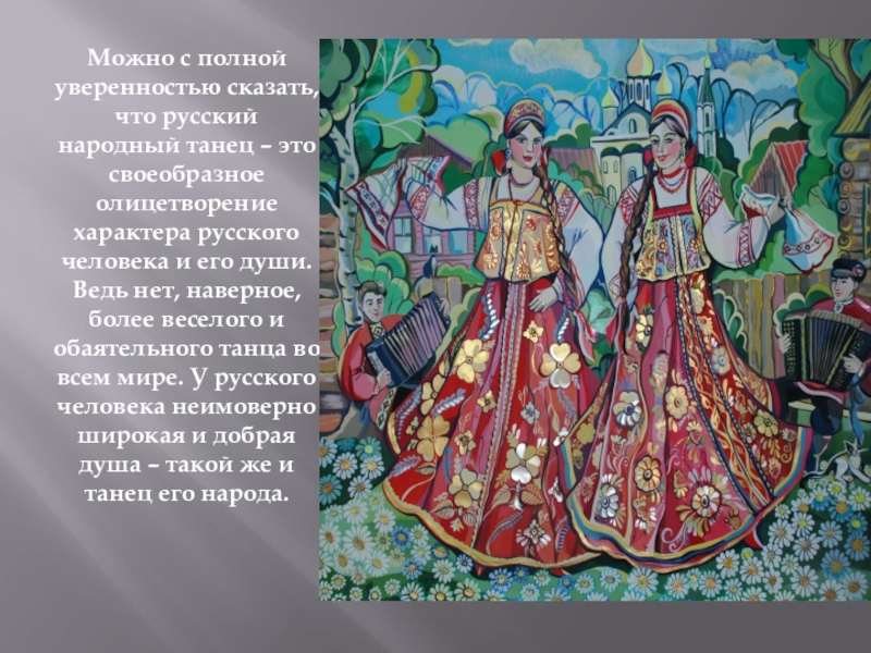 Слайд 10Можно с полной уверенностью сказать, что русский народный танец – это