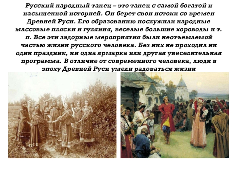 историей. Он берет свои истоки со времен Древней Руси. Его образованию послужили народные массовые пляски и гуляния, веселые большие хороводы и т.п. Все эти задорные мероприятия были неотъемлемой частью жизни русского человека. Без них не проходил ни один праздник, ни одна ярмарка или другая увеселительная программа. В отличие от современного человека, люди в эпоху Древней Руси умели радоваться жизни