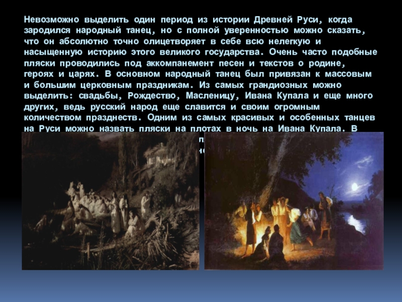 танец, но с полной уверенностью можно сказать, что он абсолютно точно олицетворяет в себе всю нелегкую и насыщенную историю этого великого государства. Очень часто подобные пляски проводились под аккомпанемент песен и текстов о родине, героях и царях. В основном народный танец был привязан к массовым и большим церковным праздникам. Из самых грандиозных можно выделить: свадьбы, Рождество, Масленицу, Ивана Купала и еще много других, ведь русский народ еще славится и своим огромным количеством празднеств. Одним из самых красивых и особенных танцев на Руси можно назвать пляски на плотах в ночь на Ивана Купала. В этот вечер происходило массовое гулянье с песнями и танцами, а незамужние девушки пускали по речной глади венок из цветов в поисках жениха.