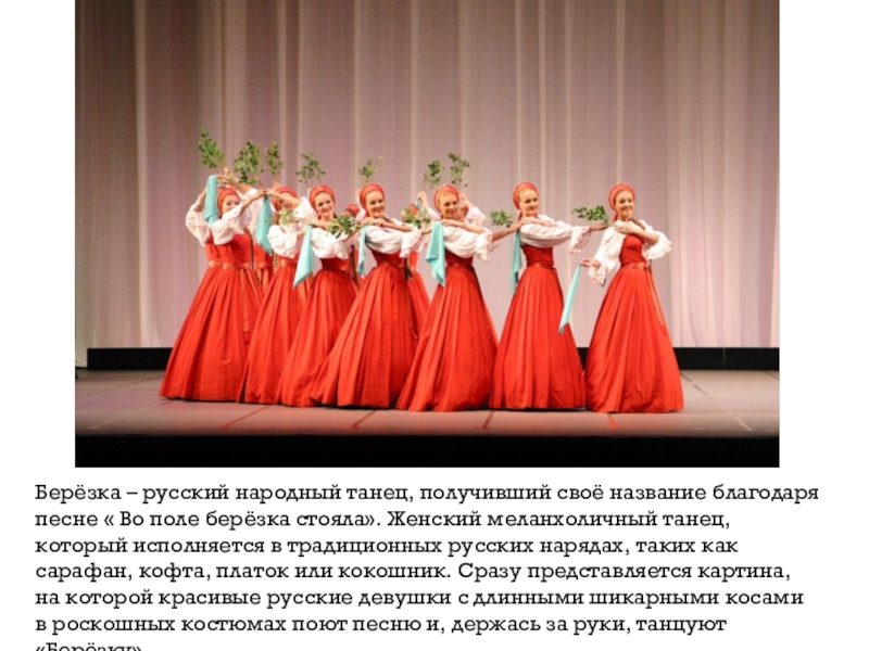Слайд 7Берёзка – русский народный танец, получивший своё название благодаря песне «