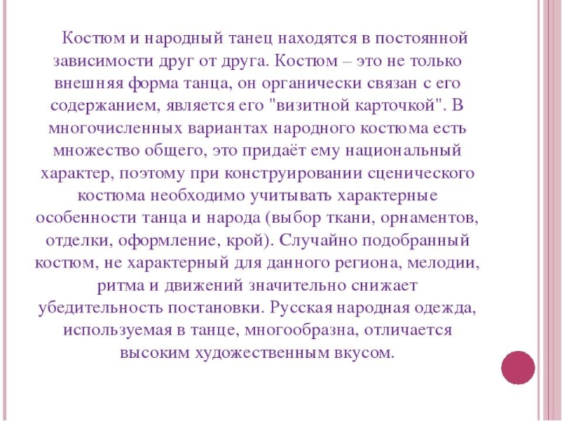 своеобразное олицетворение характера русского человека и его души. Ведь нет, наверное, более веселого и обаятельного танца во всем мире. У русского человека неимоверно широкая и добрая душа – такой же и танец его народа.