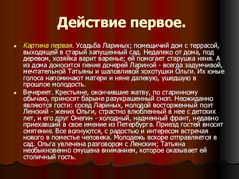 в старый запущенный сад. Недалеко от дома, под деревом, хозяйка варит варенье; ей помогает старушка няня. А из дома доносится пение дочерей Лариной - всегда задумчивой, мечтательной Татьяны и шаловливой хохотушки Ольги. Их юные голоса напоминают матери и няне далекую, ушедшую в прошлое молодость.