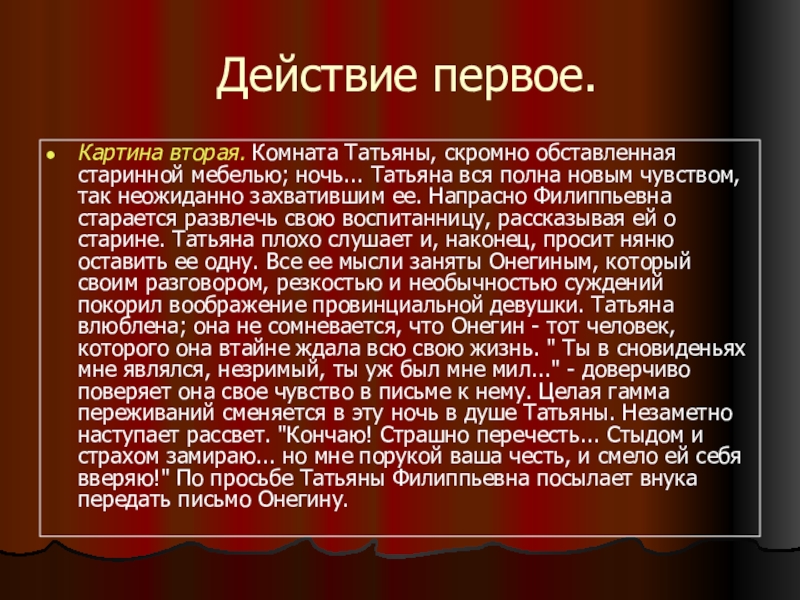вся полна новым чувством, так неожиданно захватившим ее. Напрасно Филиппьевна старается развлечь свою воспитанницу, рассказывая ей о старине. Татьяна плохо слушает и, наконец, просит няню оставить ее одну. Все ее мысли заняты Онегиным, который своим разговором, резкостью и необычностью суждений покорил воображение провинциальной девушки. Татьяна влюблена; она не сомневается, что Онегин - тот человек, которого она втайне ждала всю свою жизнь. " Ты в сновиденьях мне являлся, незримый, ты уж был мне мил..." - доверчиво поверяет она свое чувство в письме к нему. Целая гамма переживаний сменяется в эту ночь в душе Татьяны. Незаметно наступает рассвет. "Кончаю! Страшно перечесть... Стыдом и страхом замираю... но мне порукой ваша честь, и смело ей себя вверяю!" По просьбе Татьяны Филиппьевна посылает внука передать письмо Онегину.