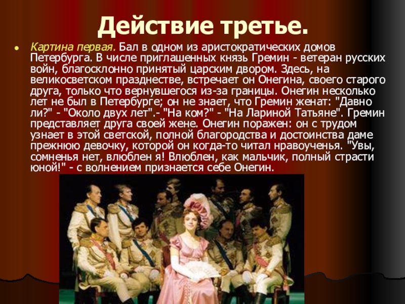 В числе приглашенных князь Гремин - ветеран русских войн, благосклонно принятый царским двором. Здесь, на великосветском празднестве, встречает он Онегина, своего старого друга, только что вернувшегося из-за границы. Онегин несколько лет не был в Петербурге; он не знает, что Гремин женат: "Давно ли?" - "Около двух лет".- "На ком?" - "На Лариной Татьяне". Гремин представляет друга своей жене. Онегин поражен: он с трудом узнает в этой светской, полной благородства и достоинства даме прежнюю девочку, которой он когда-то читал нравоученья. "Увы, сомненья нет, влюблен я! Влюблен, как мальчик, полный страсти юной!" - с волнением признается себе Онегин.