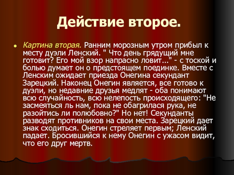 " Что день грядущий мне готовит? Его мой взор напрасно ловит..." - с тоской и болью думает он о предстоящем поединке. Вместе с Ленским ожидает приезда Онегина секундант Зарецкий. Наконец Онегин является, все готово к дуэли, но недавние друзья медлят - оба понимают всю случайность, всю нелепость происходящего: "Не засмеяться ль нам, пока не обагрилася рука, не разойтись ли полюбовно?" Но нет! Секунданты разводят противников на свои места. Зарецкий дает знак сходиться. Онегин стреляет первым; Ленский падает. Бросившийся к нему Онегин с ужасом видит, что его друг мертв.