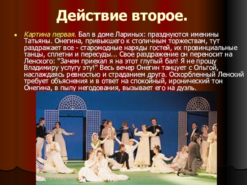 Онегина, привыкшего к столичным торжествам, тут раздражает все - старомодные наряды гостей, их провинциальные танцы, сплетни и пересуды... Свое раздражение он переносит на Ленского: "Зачем приехал я на этот глупый бал! Я не прощу Владимиру услугу эту!" Весь вечер Онегин танцует с Ольгой, наслаждаясь ревностью и страданием друга. Оскорбленный Ленский требует объяснения и в ответ на спокойный, иронический тон Онегина, в пылу негодования, вызывает его на дуэль.