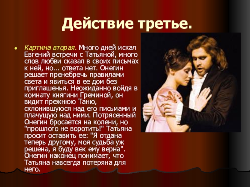 слов любви сказал в своих письмах к ней, но... ответа нет. Онегин решает пренебречь правилами света и явиться в ее дом без приглашенья. Неожиданно войдя в комнату княгини Греминой, он видит прежнюю Таню, склонившуюся над его письмами и плачущую над ними. Потрясенный Онегин бросается на колени, но "прошлого не воротить!" Татьяна просит оставить ее: "Я отдана теперь другому, моя судьба уж решена, я буду век ему верна". Онегин наконец понимает, что Татьяна навсегда потеряна для него.