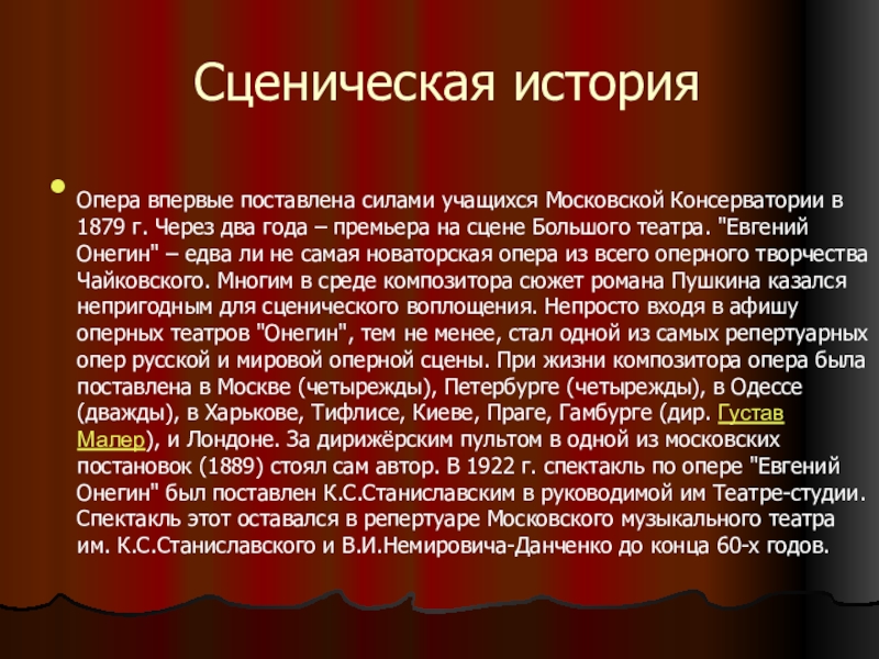 г. Через два года – премьера на сцене Большого театра. "Евгений Онегин" – едва ли не самая новаторская опера из всего оперного творчества Чайковского. Многим в среде композитора сюжет романа Пушкина казался непригодным для сценического воплощения. Непросто входя в афишу оперных театров "Онегин", тем не менее, стал одной из самых репертуарных опер русской и мировой оперной сцены. При жизни композитора опера была поставлена в Москве (четырежды), Петербурге (четырежды), в Одессе (дважды), в Харькове, Тифлисе, Киеве, Праге, Гамбурге (дир. Густав Малер), и Лондоне. За дирижёрским пультом в одной из московских постановок (1889) стоял сам автор. В 1922 г. спектакль по опере "Евгений Онегин" был поставлен К.С.Станиславским в руководимой им Театре-студии. Спектакль этот оставался в репертуаре Московского музыкального театра им. К.С.Станиславского и В.И.Немировича-Данченко до конца 60-х годов.