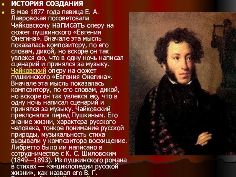 написать оперу на сюжет пушкинского «Евгения Онегина». Вначале эта мысль показалась композитору, по его словам, дикой, но вскоре он так увлекся ею, что в одну ночь написал сценарий и принялся за музыку. Чайковский оперу на сюжет пушкинского «Евгения Онегина». Вначале эта мысль показалась композитору, по его словам, дикой, но вскоре он так увлекся ею, что в одну ночь написал сценарий и принялся за музыку. Чайковский преклонялся перед Пушкиным. Его знание жизни, характера русского человека, тонкое понимание русской природы, музыкальность стиха вызывали у композитора восхищение. Либретто было им написано в сотрудничестве с К. С. Шиловским (1849—1893). Из пушкинского романа в стихах — «энциклопедии русской жизни», как назвал его В. Г. Белинский, — Чайковский взял лишь то, что было связано с душевным миром и личными судьбами пушкинских героев, скромно назвав свою оперу «лирическими сценами».