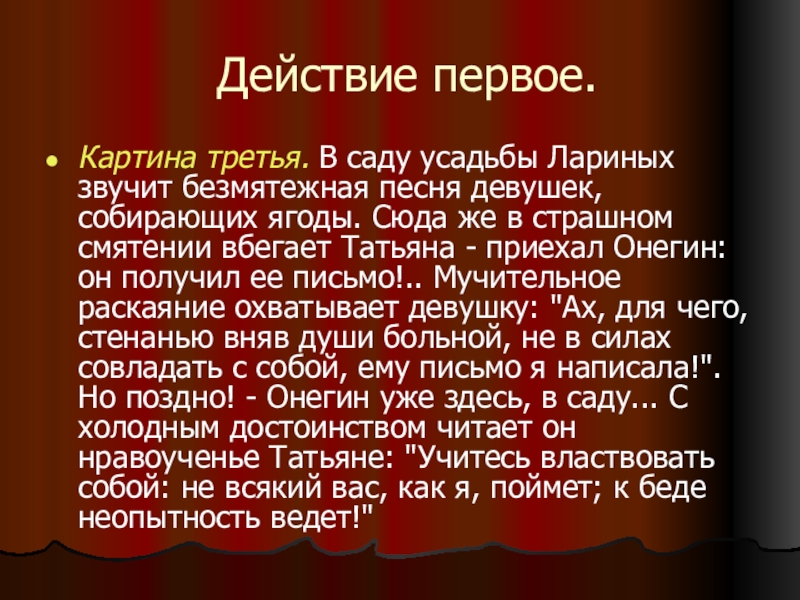 собирающих ягоды. Сюда же в страшном смятении вбегает Татьяна - приехал Онегин: он получил ее письмо!.. Мучительное раскаяние охватывает девушку: "Ах, для чего, стенанью вняв души больной, не в силах совладать с собой, ему письмо я написала!". Но поздно! - Онегин уже здесь, в саду... С холодным достоинством читает он нравоученье Татьяне: "Учитесь властвовать собой: не всякий вас, как я, поймет; к беде неопытность ведет!"