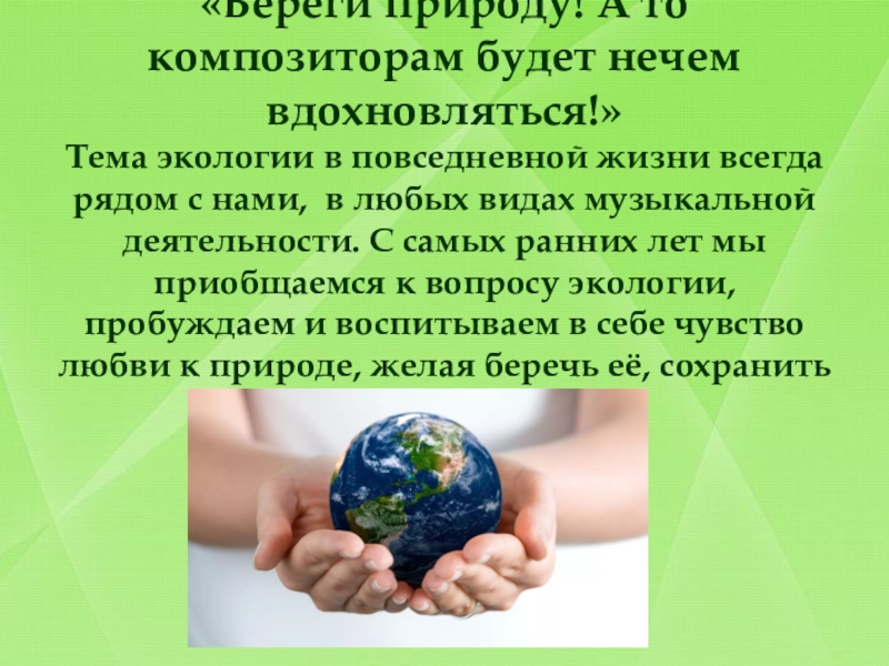 жизни всегда рядом с нами, в любых видах музыкальной деятельности. С самых ранних лет мы приобщаемся к вопросу экологии, пробуждаем и воспитываем в себе чувство любви к природе, желая беречь её, сохранить и сделать лучше!