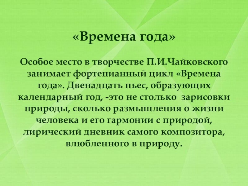 Особое место в творчестве П.И.Чайковского занимает фортепианный цикл «Времена года».