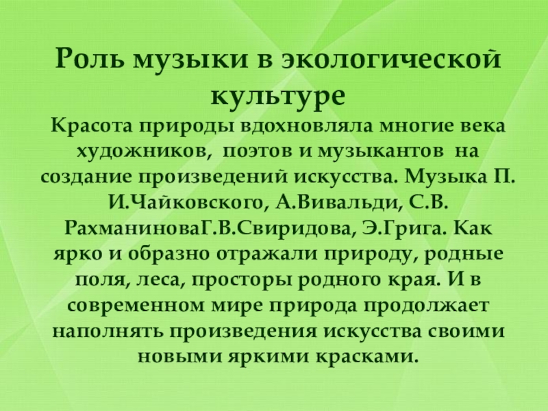 поэтов и музыкантов на создание произведений искусства. Музыка П.И.Чайковского, А.Вивальди, С.В.РахманиноваГ.В.Свиридова, Э.Грига. Как ярко и образно отражали природу, родные поля, леса, просторы родного края. И в современном мире природа продолжает наполнять произведения искусства своими новыми яркими красками.