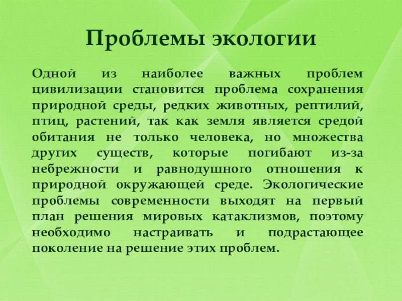среды, редких животных, рептилий, птиц, растений, так как земля является средой обитания не только человека, но множества других существ, которые погибают из-за небрежности и равнодушного отношения к природной окружающей среде. Экологические проблемы современности выходят на первый план решения мировых катаклизмов, поэтому необходимо настраивать и подрастающее поколение на решение этих проблем.