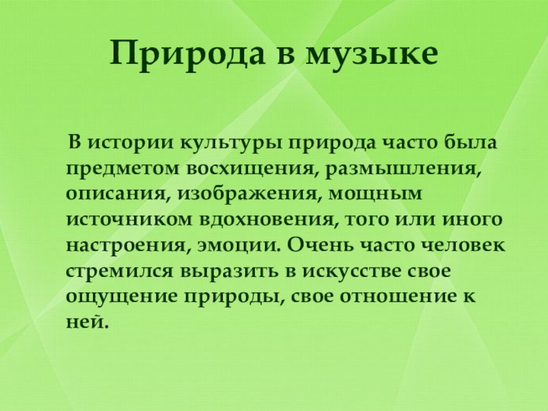 предметом восхищения, размышления, описания, изображения, мощным источником вдохновения, того или иного настроения, эмоции. Очень часто человек стремился выразить в искусстве свое ощущение природы, свое отношение к ней.